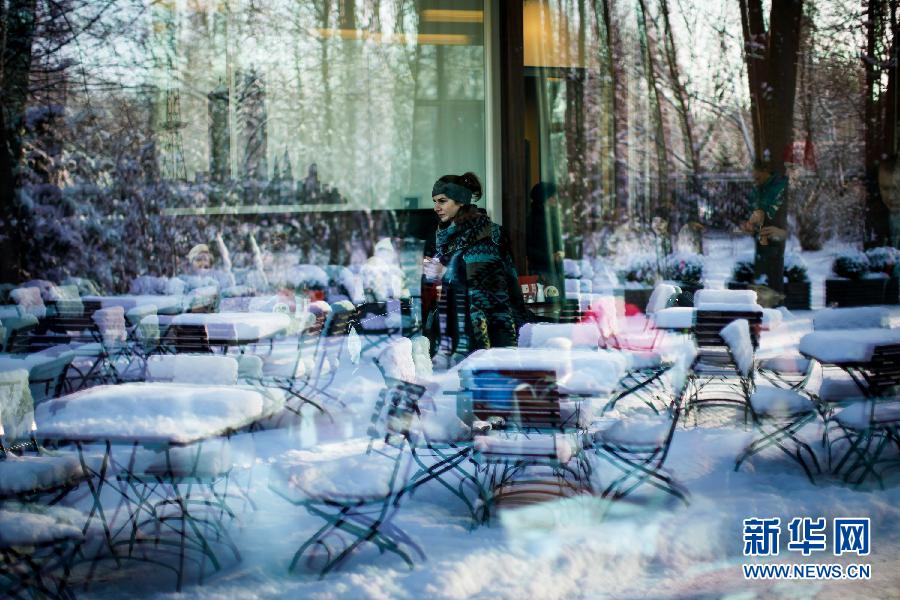 12月29日,在德国柏林,一名女子从一家咖啡馆内走过,玻璃上映出室外被雪覆盖的桌椅。德国柏林于圣诞节后迎来今冬第一轮降雪。29日柏林市气温降至摄氏零下四度。气象部门预计,大雪、降温和冷风天气将一直持续到新年。新华社记者张帆摄