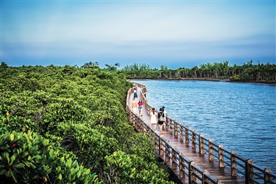 海南东寨港国家级自然保护区,游客在旅游栈道上饱览美景。本报记者 李幸璜 摄 有人类生存的地方,就不可避免存在着保护环境与生态发展的矛盾。一边是红树林的保护需求,一边是人类的生产生活需求,如何解决?答案是:开发红树林生态旅游及关联产业,引导当地居民转产就业。一年多来,海口正尝试着用与环境本身紧密相结合的旅游产业作为一种可利用的经济资源和发展资本,来解决环境保护与经济发展矛盾,这种探索已初见成效。