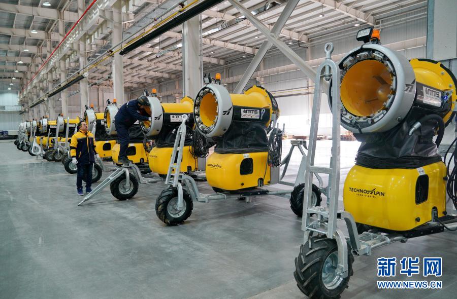 12月5日,天冰冰雪设备(张家口)有限公司的工人在生产车间内查验造雪机。