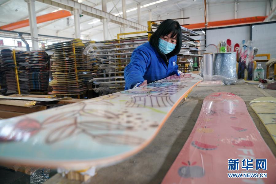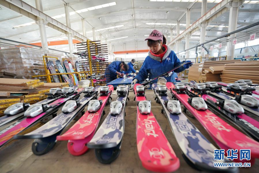 12月5日,张家口京禧体育器材有限公司的工人在生产车间内制作滑雪板。