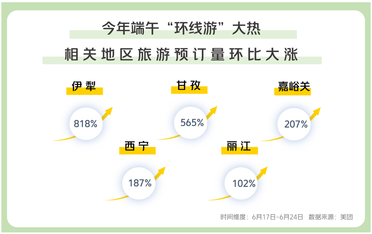 美团、大众点评数据显示,截至6月14日,端午假期三天的旅游预订量(含酒店、民宿、景点门票、交通)同比增长近600%。近一周,“环线游”相关搜索则同比大增650%,其中,甘青环线、川西环线、新疆、云南的搜索热度均环比翻倍上涨,成为大热门。
