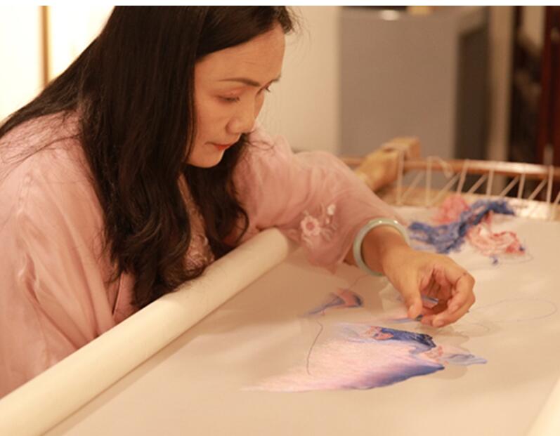 非遗苏绣传承人卢梅红在创作“青山”图案。(花西子供图)
