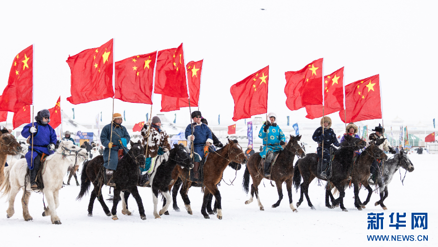 开幕式设计独具匠心,100匹蒙古马组成的国旗方队率先入场,五星红旗在冰雪草原上飘扬,传递草原儿女的家国情怀;锡林浩特市公安局蒙古马骑警大队紧随其后,飒爽英姿尽显守护边疆的责任担当;13个旗县市区代表队驭风而来,各具地域特色的风采展现草原健儿的豪迈气概。伴随着《万马奔腾》的唱响,8匹会旗马队踏节而来,全场观众起立奏唱国歌,激昂旋律回荡雪域。