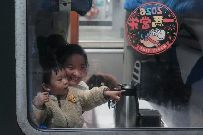 2月2日凌晨,在北京西站,2岁的小朋友吉祥(前)跟随妈妈一起乘坐K4069次列车返回阜阳老家过年。新华社记者鞠焕宗摄